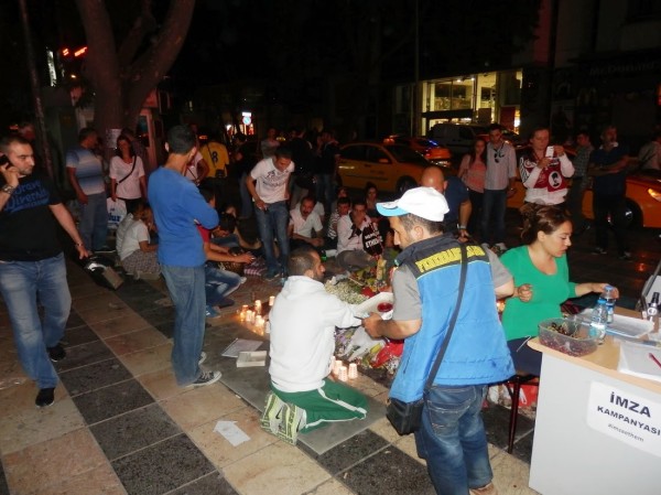 Stasera abbiamo deciso di tornare a Kizilay per vedere se c’era qualche manifestazione di protesta a Güven Park. All’improvviso è comparsa una lunga processione di persone che tenevano in mano delle candele: camminavano in silenzio, dirette verso il punto della piazza dove è sorto una specie di altare di omaggio e commemorazione dei quattro giovani uccisi dalla polizia nelle ultime settimane. Arrivati là ognuno posava a terra la sua candela e una persona le sistemava intorno alle foto dei quattro giovani. C’era molta gente tutt’intorno, in piedi e seduta, in un’atmosfera tranquilla e dignitosa e tutti firmavano la petizione che noi abbiamo sottoscritto ieri, per chiedere che i responsabili della morte dei manifestanti vengano processati. Il silenzio era rotto dai clacson delle auto che passavano e dagli applausi delle persone intorno alla piazza. Sembra che negli ultimi due giorni il numero di persone che partecipano a questa nuova forma di protesta sia aumentato molto. La gente sta creando una sua forma di spiritualità, forse non in modo cosciente, ma esprimendo comunque un sentimento molto intenso.