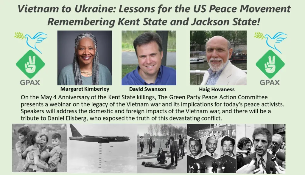 MAY 4th Webinar Vietnam to Ukraine: Lessons for the US Peace Movement Remembering Kent State and Jackson State! Margaret Kimberley, Black Agenda Report David Swanson, World BEYOND War And Haig Hovaness, GPAX’s Tribute to Daniel Ellsberg. Cosponsors: Green Party Peace…