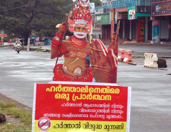 Hartal Virudha Munnani, an anti hartal organisation – an action front of Humanist Movement put up a hoarding in the form of a prayer to Muthappan, an local ethnic god, to save the state from hartals.