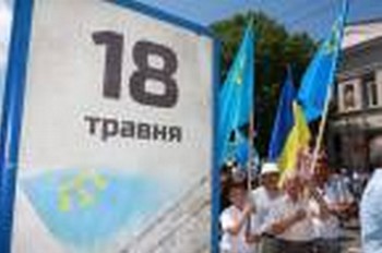 Picture: A sign held aloft during a commemoration marks the date, 18 May, that the Crimean Tatars were deported in 1944.