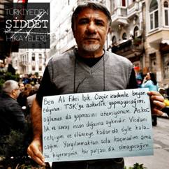 The placard says: “I am Ali Fikri Isik. With my free will I declare: I will not be a soldier of the Turkish Armed Forces. I don’t want my son to be one either. Being a soldier and war are against human nature. I’m a conscientious objector and I will remain so until I die. I have never attempted to escape trial but I will not be a part of this hierarchy.”