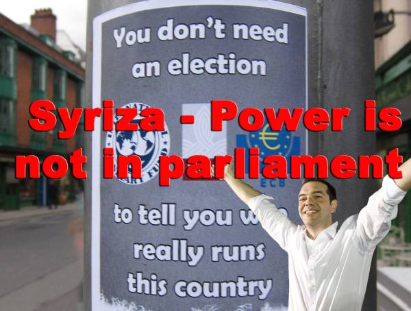 The rise of Syriza is so recent that there can be very few who are in the leadership simply out of a desire for power. Which will make the real reasons for any retreat from their promises very clear: the nature of the electoralist system itself and how it connects and is controlled by the interests of the 1%. The discovery, when faced with the threat of capital flight on the one hand and military coup on the other, is that within the rules of the electoralist game There Is No Alternative after all.