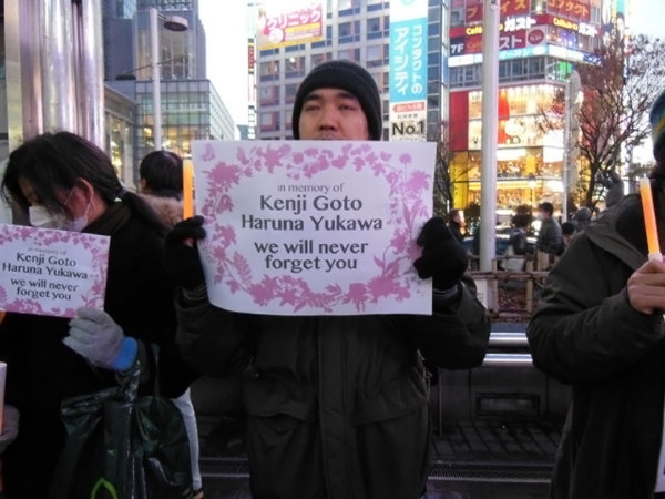 Vigil for the victims of the recent ISIS hostage crisis, Kenji Goto and Haruna Yukawa, took place simultaneously in eight different cities (Sapporo, Sendai, Chiba, Osaka, Kyoto, Nagoya, and Fukuoka) in Japan at five o’clock in the evening on February 8. This event was not in fact organized or coordinated by any particular individuals or by any organizations. Rather, it came about spontaneously by the request of people who expressed their desire on the Internet to have a vigil.