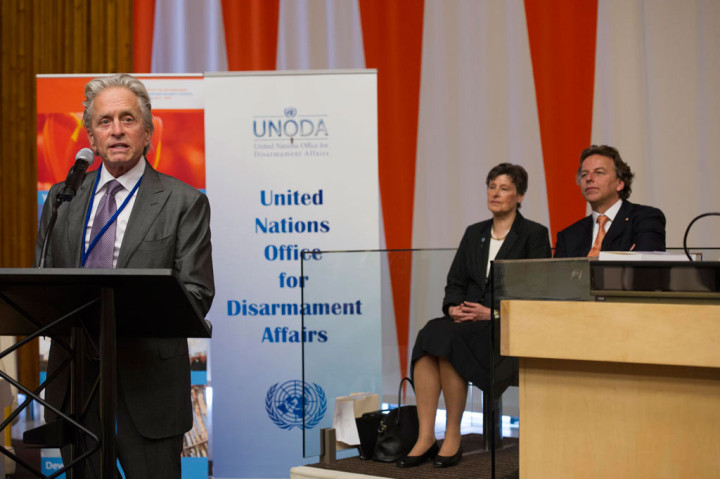 Ms. Kane (second from right) looks on as UN Messenger of Peace Michael Douglas (left) addresses the opening of an academic symposium held on the margins of the NPT Review Conference held in April 2015 in New York. UN Photo/Eskinder Debebe