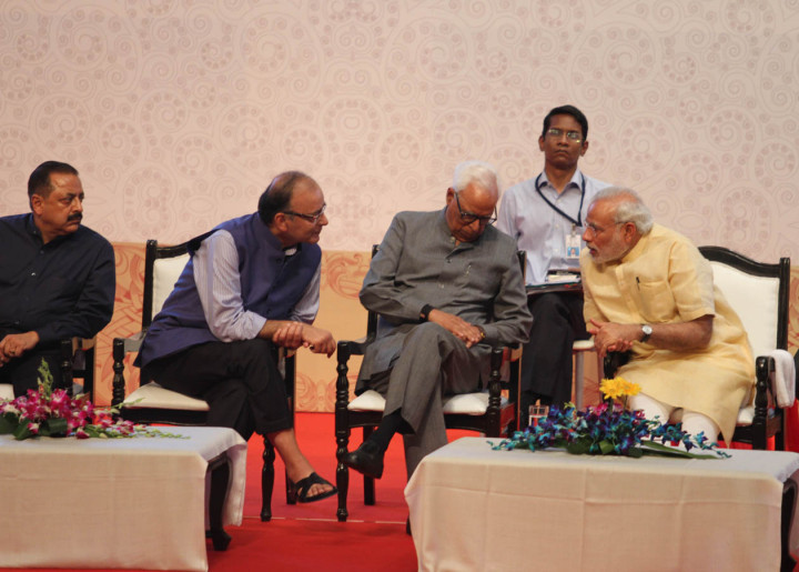 Prime Minister Narendra Modi is ushered to his place by Union Finance Minister Arun Jaitley in Jammu.