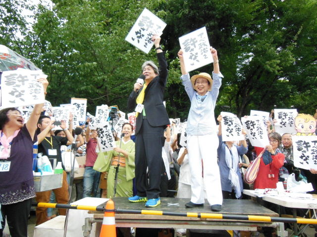 It was a nationwide protest orchestrated by a non-fiction writer, Ms. Hisae Sawachi. The striking calligraphy on the poster was done by a haiku poet, Mr. Tota Kaneko who is 95 years old and a former Imperial Japanese Navy officer. It went viral when Ms. Sawachi made an announcement on her website asking the public to display the poster simultaneously and ambiguously on Saturday, July 18 at 1PM, calling for the nationwide public demonstration. Her statement read, “If you are not sure about being in a public rally, then you can display the poster in front of your house and on windows.” She asked for demonstrations in train stations, schools, and any public places in Tokyo and elsewhere. Her statement ended with, “Expressing one’s opinion may require a courage to do so, and our courage to “say NO (to the Abe government) ” is being challenged right now. It is our duty and our right to stop this political violence.”