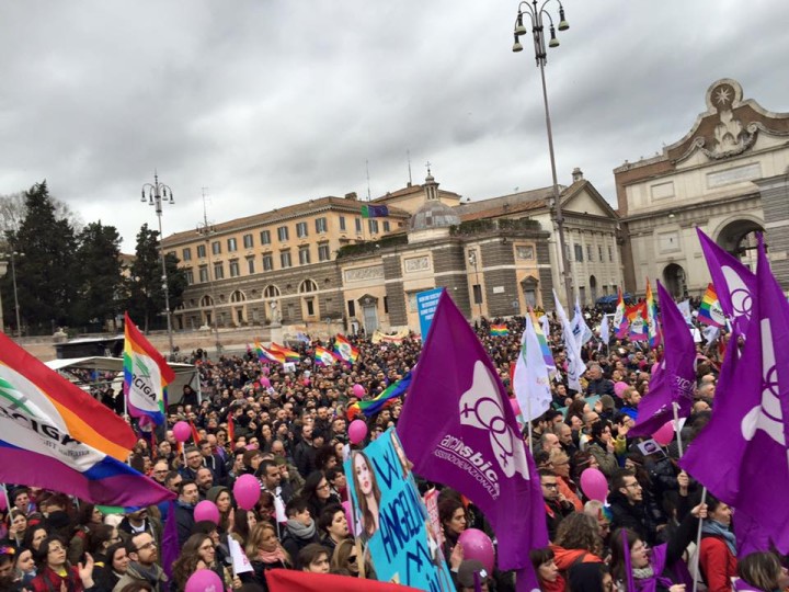 On Saturday 5th March, in Rome a demonstration announced two weeks ago to demand equal rights for gays and lesbians took place in Piazza del Popolo. The law approved in the Senate is a first step, but it is considered inadequate. It is necessary to obtain stepchild adoption to protect children, who were in the square in large numbers. Amnesty International, Cgil (an important union) and several political parties endorsed the demonstration.