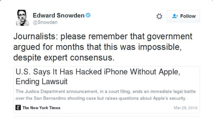 “Please remember that government argued for months that this was impossible, despite expert consensus.” —Edward SnowdenThe case that became known as Apple vs. FBI, which pitched digital privacy and civil liberties advocates against the federal government, created an international stir as Apple challenged a court ruling demanding that it create code that would allow federal agents to get inside the locked phone of Syed Farook, who along with his wife killed 14 people and wounded 22 others during a workplace shooting in December.