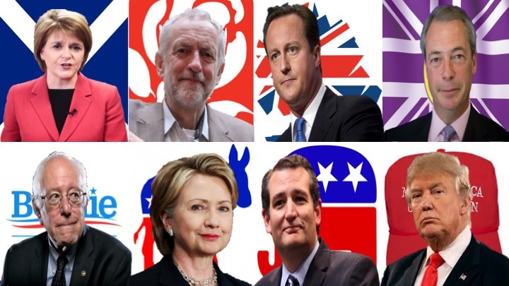 One can see political parallels across the pond, in the UK’s 2015 Parliamentary elections. The two main parties in Westminster Palace, Conservative and Labour (roughly equivalent to the GOP and Democrats), were shaken up by two popular insurgencies. UKIP, the UK Independence Party, rose up from the rising flames of the relatively conservative British heartland’s fears of free trade in the EU and immigration, winning an eighth of the popular vote in England.To the north, SNP, the Scottish National Party, won 95% of Scotland’s seats by inspiring among other things, record youth turnout[i]and social media support (sound familiar?)[ii], with a message of social democracy and defiance against the British status quo.