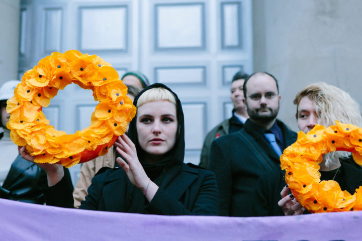 Last night, campaign group Lesbians and Gays Support the Migrants placed wreaths of life-jacket-orange poppies on the Cenotaph to commemorate the more than 4,200 people who have died in the last year trying to reach Europe. The campaigners marched down Whitehall dressed in black with pink veils to conduct a remembrance ceremony at the Cenotaph holding a minute’s silence.