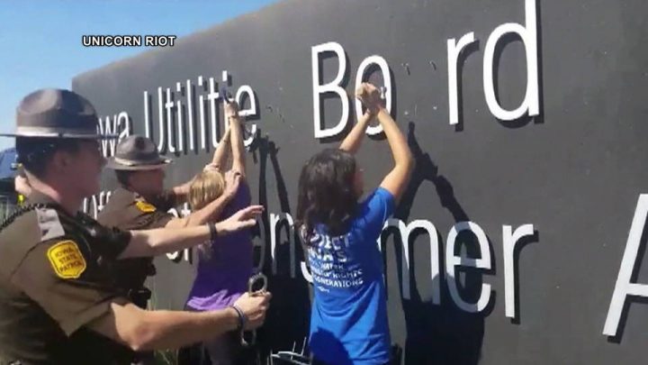 The two were speaking in front of the Iowa Utilities Board office. After delivering their statement, the two used a hammer and a crowbar to damage the letters of the Iowa Utilities Board sign in protest of the board’s decision Friday to reject a lawsuit by environmental groups seeking to have the pipeline’s state permit revoked, which would have forced the pipeline to shut down.