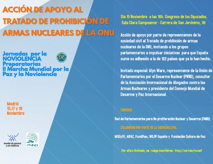 Several social organisations such as World without Wars and Violence, the Spanish Peace Research Association, the Peace Culture Foundation and the Women’s International League for Peace and Freedom – Spain, among others, have taken the initiative to take this debate to the Spanish Parliament, calling on parliamentary groups to take a stand on this matter and to ask the government why Spain is not among those 122 countries that have been working on the elaboration of this Treaty, and calling on all deputies and senators in Spain to attend the event that will take place on Wednesday, the 15th of November, at 4pm in the Clara Campoamor Hall in the Spanish Congress.