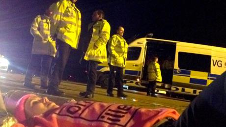Within a few minutes, security guards arrived; by that time, the activists had already made it impossible for the plane to move in either direction, effectively cancelling the flight. The 15, from a coalition of three groups (End Deportations, Lesbians and Gays Support the Migrants, and Plane Stupid), remained on the tarmac throughout the night as the police worked to release them, with the last arrest at around 8am.