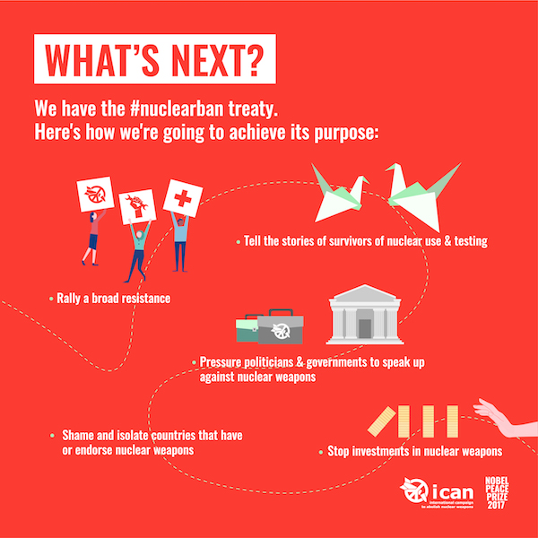 On July 7th, 2017, the UN adopted the Treaty on the Prohibition of Nuclear Weapons. This historic treaty bans nuclear weapons and all activities related to them. One it enters into force, this legally binding treaty will prohibit nations from: