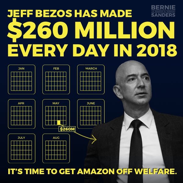Sanders also reiterated a fact that he has trumpeted repeatedly over the past several weeks: According to public data, thousands of Amazon workers are forced to rely on public assistance programs like food stamps and Medicaid to survive because Amazon CEO Jeff Bezos—the richest man in the world—refuses to pay a living wage.