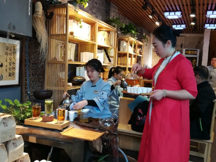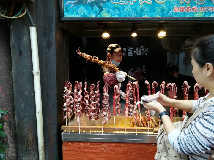 Food, Food, and More Food. The village was bustling and alive with many visitors, both locals and foreigners alike, enjoying the many wares and attractions offered by the shops that lined the streets. All kinds of food were being prepared right before your very eyes. Hawkers in colorful costumes stood in front of the shops and restaurants in a bid to attract your attention. We walked past stall upon stall of food– all kinds of barbeque, pancakes, dumplings, hotpot, preserves, fruits, savory snacks, pastries, nuts, seeds and other exotic delicacies that made you wonder, What on earth are they? Many tea shops and bars of course! Although the city is no longer a part of the Sichuan province, it still shares its history and culture as can be seen in its hot and spicy cuisine as many of the dishes are made with the famous Sichuan peppers.