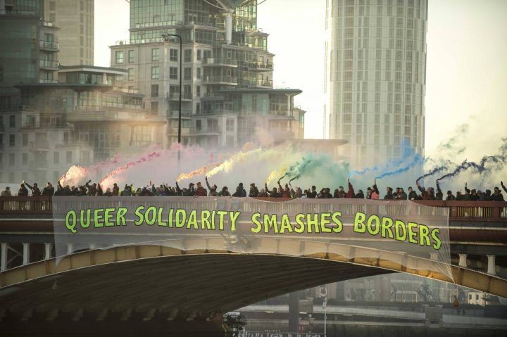 Not long ago, LGBT+ people were the “illegals” and queer pubs and bars were being targeted in police raids and subject to state violence. Now, it is homes and workplaces of migrants that are targeted. Our queerness is weaponised by the state and media. Hard-won rights for LGBT+ people are presented as part of “British” or “European” values and migrants, particularly Muslim migrants, are constructed as a threat to these values. We see through this attempt to pit oppressed and exploited groups against each other. Through fundraising and creative direct action, we stand in solidarity with all migrants. We fight back against homonationalism. We build on a proud history of queer solidarity to say: no one is illegal.