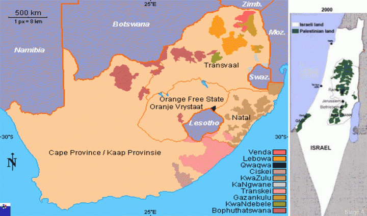 I expect you are all familiar with the maps showing the radical shrinking of Palestinian land over 70 years due to the expansion of colonial Israeli settlement. Startling and appalling, yes, but to me they bring back strong memories of other maps, in a precisely analogous situation, which goes to the heart of why Israel is an apartheid state.
