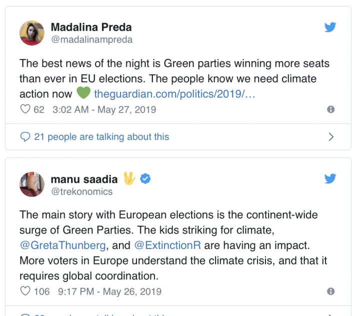“The best news of the night is Green parties winning more seats than ever in EU elections,” tweeted environmentalist Madalina Preda. “The people know we need climate action now.”