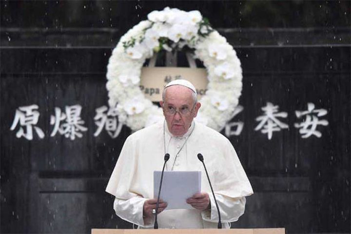 POPE FRANCIS: [translated] The use of atomic energy for the purpose of war is today more than ever a crime not only against the dignity of human beings, but against any possible future for our common home. The use of atomic energy for the purpose of war is immoral, just as the possessing of nuclear weapons is immoral, as I already said two years ago. We will be judged by this. Future generations will rise to condemn our failure if we spoke of peace but did not act to bring it about among the peoples of the earth. How can we speak of peace even as we build terrifying new weapons of war? How can we speak of peace even as we justify illegitimate actions by speeches filled with discrimination and hate?