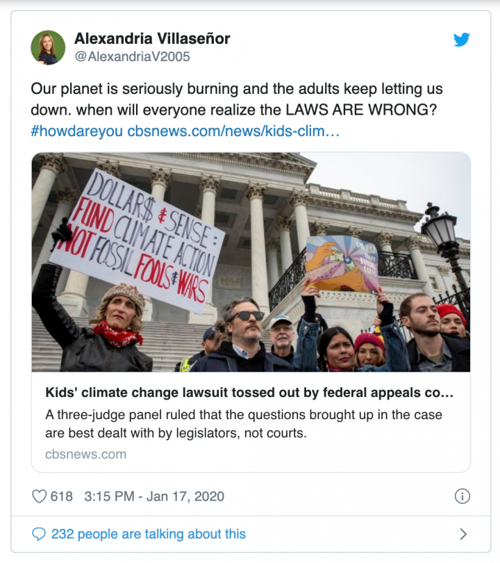 Alexandria Villaseñor, not a party to the suit but a leading youth climate activist in the U.S., tweeted: