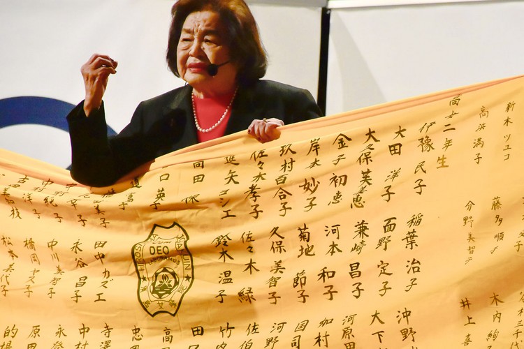The banner shows the names of more than 300 schoolchildren, Setsuko’s schoolmates who died in the Hiroshima nuclear explosion.