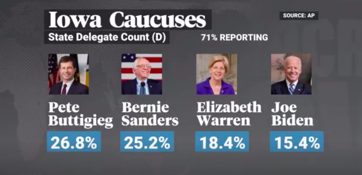 d of voting, followed by Buttigieg and then Senator Elizabeth Warren. Former Vice President Joe Biden placed fourth, followed by Senator Amy Klobuchar. Meanwhile, Buttigieg currently has 26.8% of delegate equivalents, followed by Bernie Sanders with 25.2%. But again, about a quarter of the vote still remains to be counted.