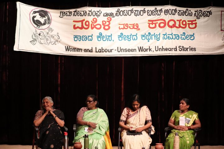 Bengaluru Senior Economist Jaya Mehta, Ex-Minister Motamma, well-known singer M.D.Pallavi and Navajeevana Mahila Sangha, senior member Mokshamma inaugurated the Convention on “Women and Labour – Unseen Work, Unheard Stories” with a plant watering ceremony. The Convention was organized by Gram Seva Sangh and CBPS (Centre for Budget and Policy Studies) and was held at the Kodaji Basappa Auditorium last February 29, 2020.