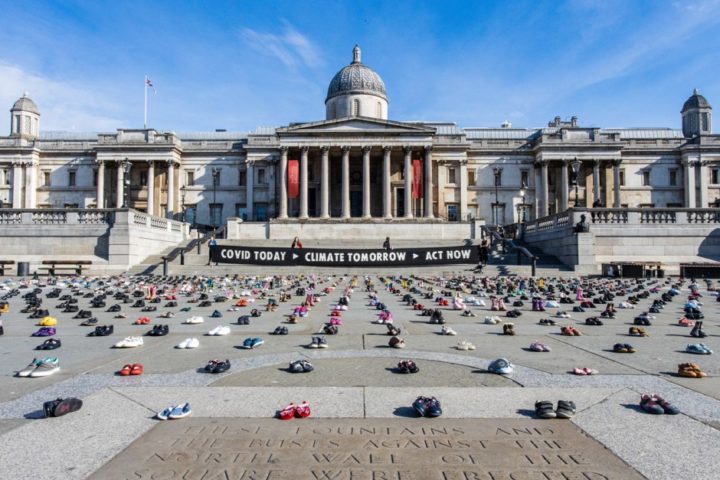 - At 8am this morning more than 2000 pairs of children’s shoes were placed in London’s Trafalgar Square with people holding a banner saying ‘Covid today > Climate tomorrow > Act Now’