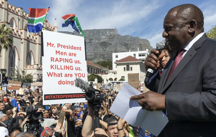 Photo: South African President Cyril Ramaphosa addresses demonstrators protesting against gender-based violence outside Parliament. Source: The Coversation/Nic Bothma