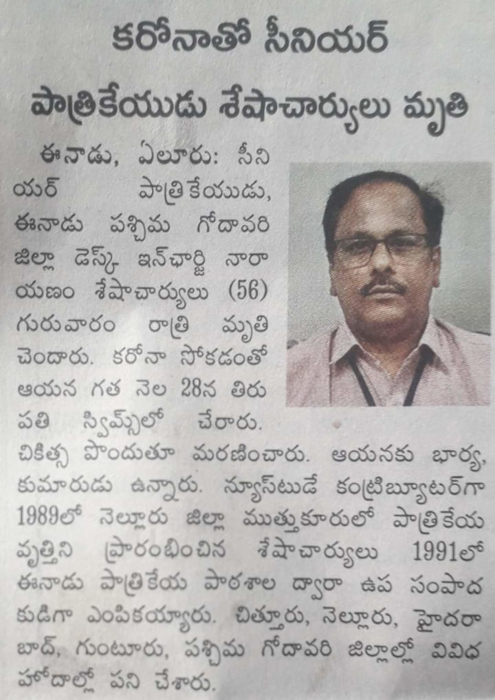 The latest report surfaced from the Nellore locality of Andhra Pradesh, where journalist Narayanam Seshacharyulu (aged 56) died of Covid-19 on 3 September 2020. Associated with the prestigious Telugu daily Eenadu, Seshacharyulu was hospitalized in Tirupati a few days back after testing positive for the virus infection. He worked in different localities like Chittoor, Muttukuru, Guntur, Hyderabad, and lately West Godavari. Seshacharyulu left behind his wife and a son with other relatives.