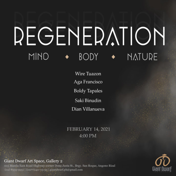As a phenomenon of life, regeneration takes on different forms, captured by the diverse paintings and artworks presented by five artists of different generations, using different aesthetic techniques and approaches. As renewal or restoration, regeneration is equally observed in the mind, in the body, and in nature. When applied in art, the concept provides fertile fields of executions and directions.
