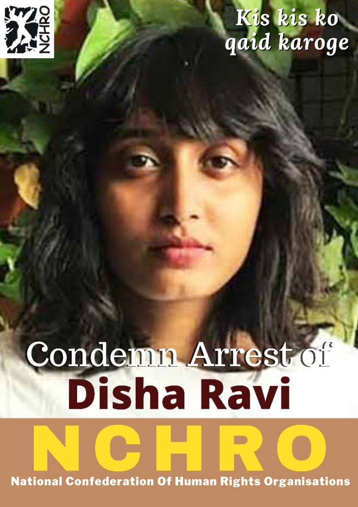 The National Confederation of Human Rights Organisations (NCHRO) condemns the arrest of Disha Ravi and the harassment of people like Nikita Jacob. The NCHRO stands with Disha Ravi and every other justice-loving person being attacked by this government.