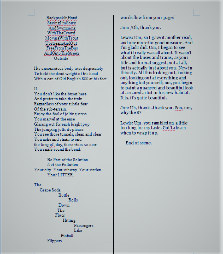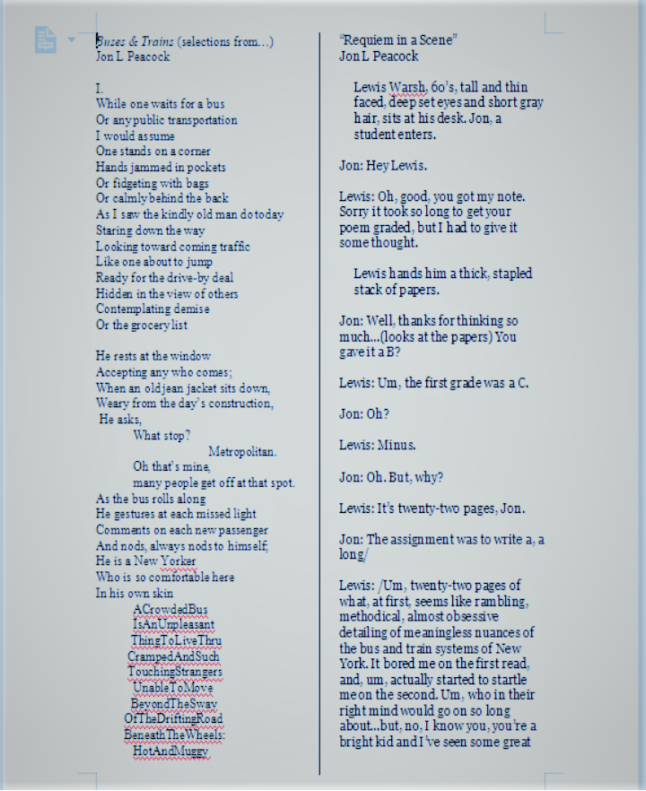Jon L Peacock graduated from LIU’s MFA program in 2010, and since then he’s made a career out of his literary and performance arts. Writings across the genres of Jon’s have been published, from poetry to plays, and he owes all of it to Lewis. www.jonLpeacock.com