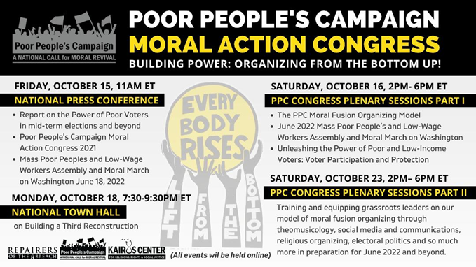 One of the two major annual events of the National Poor People’s Campaign: A National Call for Moral Revival, this year’s Moral Action Congress will once again be held online because of Covid. We will be organizing and building toward our June 18, 2022 in-person Mass Poor People’s Assembly and Moral March on Washington. (Put that on your calendar now!) The events are being held on 4 days in October, starting with a press conference at 11:00 am tomorrow, Friday. Even if you can’t attend all four events, we encourage you to register and attend when you can.
