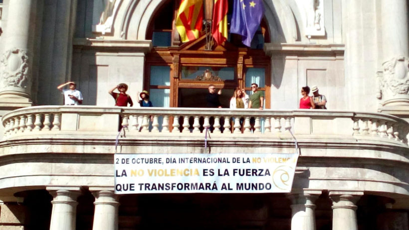 During the 3rd and 4th of October, a banner with the text: “Nonviolence is the strength that will bring us peace” presided over the balcony of the Valencia City Hall on the 3rd and 4th of October: Nonviolence is the force that will transform the world.