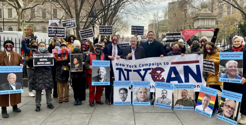 New York City-based members of the Nobel Peace Prize-winning International Campaign to Abolish Nuclear Weapons (ICAN) are celebrating the bipartisan adoption of a package of nuclear disarmament legislation by the New York City Council, Thursday, December 9, 2021.