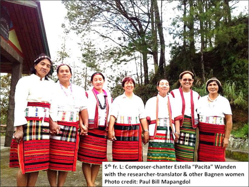Estella “Pacita” Wanden. An indigenous wisdom keeper, a known composer, and chanter, an Indigenous Peoples Education (IPEd) Program implementer of the Department of Education in Bagnen Elementary School, Bauko, Mountain Province. She is blessed with seven children. She shares her gift by teaching the children, youth, and elders in her community. She has the talent of instantaneously composing songs and chants that rhyme which the community and visitors appreciate and enjoy.
