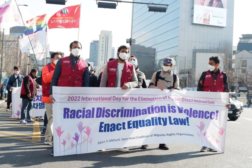 Last Sunday, March 20, 2022, a public rally was held from Seoul’s popular Gwanghwamun square to the presidential palace in observing the March 21st International Day for the Elimination of Racial Discrimination. The theme for this year chanted by demonstrators was “Racism is violence! Enact equality act!.