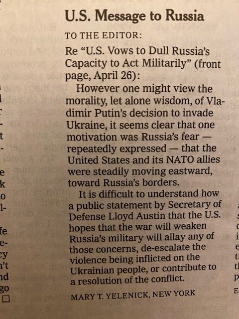 It is difficult to understand how a public statement by Secretary of Defense Lloyd Austin that the U.S. hopes that the war will weaken Russia’s military will allay any of those concerns, de-escalate the violence being inflicted on the Ukrainian people, or contribute to a resolution of the conflict.