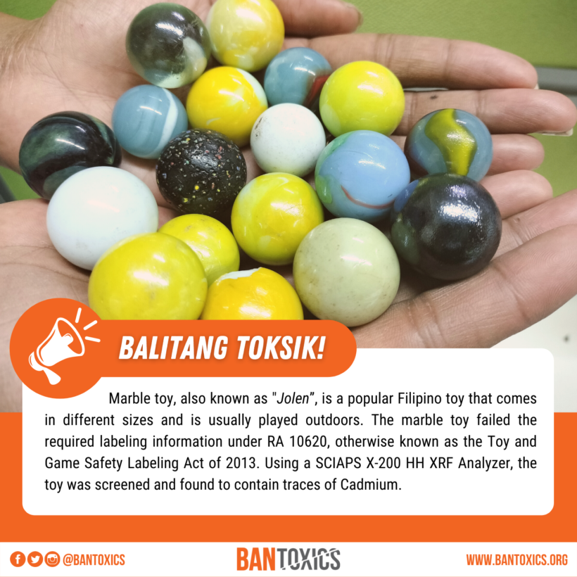 “We need to inform and caution the public, especially mothers and children, of the dangers which come from small but terrible marble toys that are sold in the market. They are choking hazards and exposure to these toys may also cause cancer,” said Thony Dizon, Toxics Campaigner, BAN Toxics.