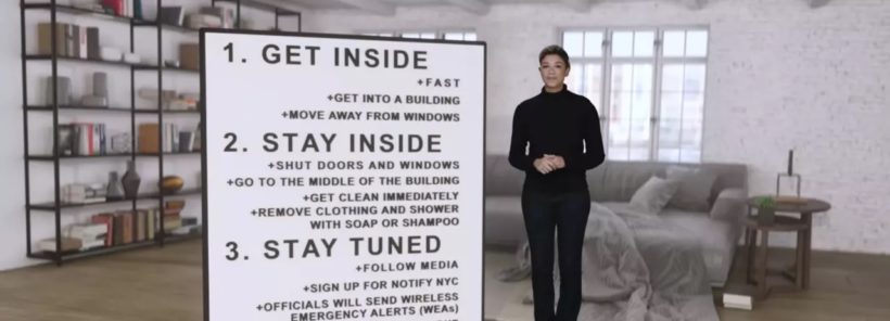 “So, there’s been a nuclear attack,” the narrator of the NYC Emergency Management video begins. “Don’t ask me how or why, just know the big one has hit.”“So what do we do?” she continues before instructing viewers to “get inside, fast,” “stay inside… and get clean immediately,” and “stay tuned; follow media for more information.”