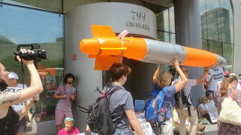 Singing peace and anti-war songs, to “lay down their swords and shields” with dramatic interventions and a multitude of posters with slogans calling for nuclear abolition in every possible way, the indomitable peace activists from every continent joined together to press the governments in the coming weeks, who promised in 1970 to make “good faith efforts” for nuclear disarmament, to “lay down their swords and shields” and make their promised “good faith” commitments to restore their tattered promises to finally ban the bomb.