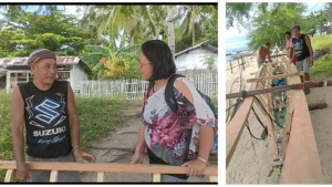 Blessed are the hands that built wooden bangkas (sailing vessels). Genevieve Balance Kupang (R) interviews Rosalito Mahusay (L), a 67-year-old master builder. For 45 years, he reveals that he makes use of the Lauan lumber from Samar as frame design, side panels, chines, inwales, transom, stem, center rib, and seat rails for boats. The two other men contracted him to build the boat. Photo credits: Dan Ignico Pronton