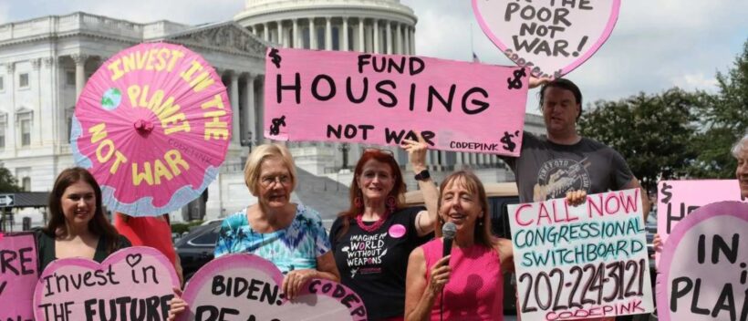 In the nation’s capital, CODEPINK co-founders Medea Benjamin and Jodie Evans, together with Colonel Ann Wright and other activists, kicked off the Week of Action, going door to door to the offices of the House Congressional Progressive Caucus (CPC), where the most natural antiwar allies would, theoretically, be found. While some members of the caucus call for much-needed diplomacy and raise concerns about the risk of nuclear war—either through a miscalculation or an intentional first strike—not one member of the nearly 100-member CPC will commit to voting against more weapons for Ukraine.