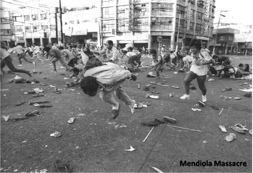 Then sporadic bursts of gunfire rang out. I instinctively shouted repeatedly, “Dapa! Dapa! Dapa!” (Drop to the ground!) and motioned to demonstrators with my two hands for them to drop to the ground. We were only able to crouch, half-bend our bodies as we were all lumped tightly together shoulder-to-shoulder in a vast sea of humanity.