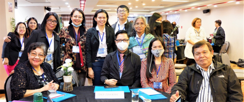 Peace Education Members: Seated fr. L: Dr. Violeta Jerusalem, Dr. Angelito Cortez, Jr., Dr. Jennifer Capistrano, Retired PNP, Ed Villamayor. Standing fr. L: Dr. Encarnacion Abinal, Dr. Genevieve Balance Kupang, Ms. Karen Evardo, Mr. Nico Candelario, and Miranimfa Medianista. 3rd Row: Dr. Theresa Cardano and Dr. Teresita Capacete.