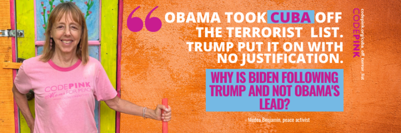 CODEPINK along with Massachusetts Peace Action, Democratic Socialists of America, the Latin America Working Group, the Chicago Religious Leadership Network, and others calls for a National Call-In to the White House to Remove Cuba from the List of State Sponsors of Terrorism. The call-in will occur on March 15th and 16th from 11 am to 3 pm EST.