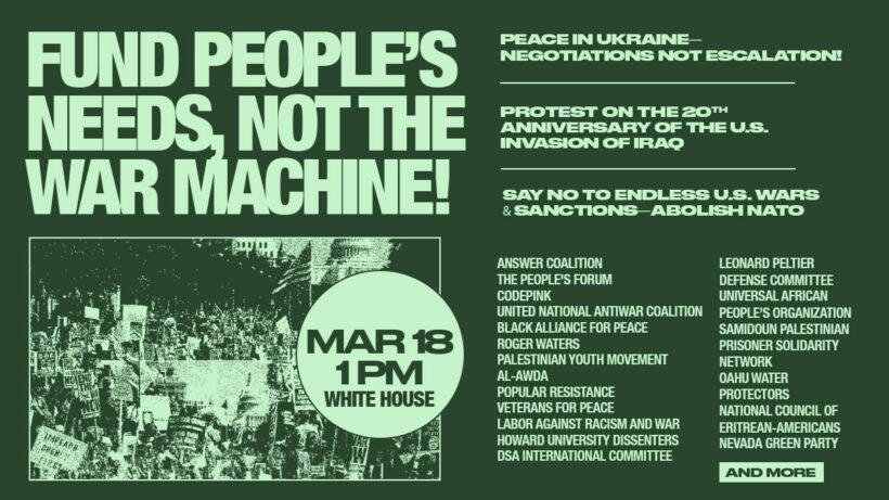 Coinciding with the 20th anniversary weekend of the criminal U.S.-invasion of Iraq a major set of actions will take place including a demonstration at the White House in Washington, D.C. on Saturday March 18 demanding “Peace in Ukraine – Say NO to Endless U.S. Wars” and “Fund People’s Needs, Not the War Machine.” Since 2003, the U.S. has engaged in sanctions (economic war) on more than 40 countries. These targets of U.S. economic warfare include the people of Cuba, Zimbabwe, Venezuela, Ethiopia, Eritrea, Iran and many other nations. Even in the wake of the worst disasters, like the recent deadly earthquake, Washington keeps its cruel sanctions in place against Syria. U.S. bases and “commands” blanket most of the world. It is a global empire.