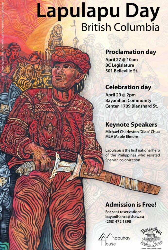 Two years later, the BC (British Columbia) Government – through the Office of Parliamentary Secretary (Anti-Racism) MLA Mable Elmore, sponsors a bill with the Legislative Assembly of British Columbia proclaiming April 27 as Lapulapu Day. A group of artists with the Bayanihan Centre in Victoria, BC will stage on April 29 an excerpt of Nicolas B. Pichay’s “Lapulapu: Ang Datu ng Mactan” in support of MLA Elmore’s bill.